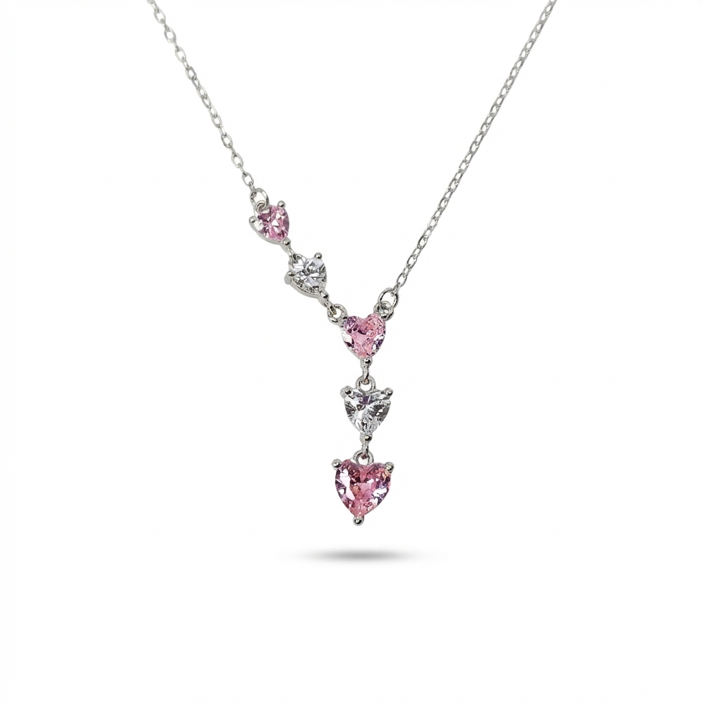 A graceful heart-drop necklace crafted in 925 sterling silver, featuring alternating pink and white heart-cut cubic zirconia stones. The cascading design adds soft movement and sparkle, making it a perfect choice for romantic occasions, gifting, and elegant everyday wear.