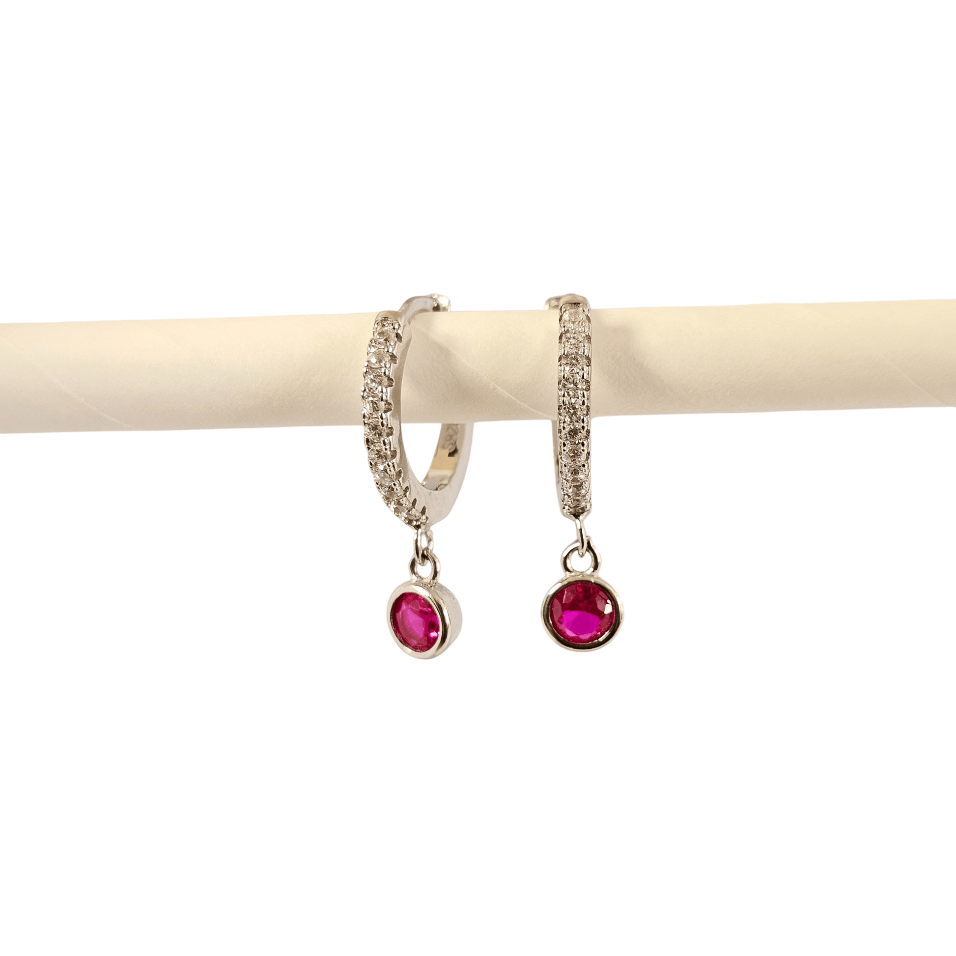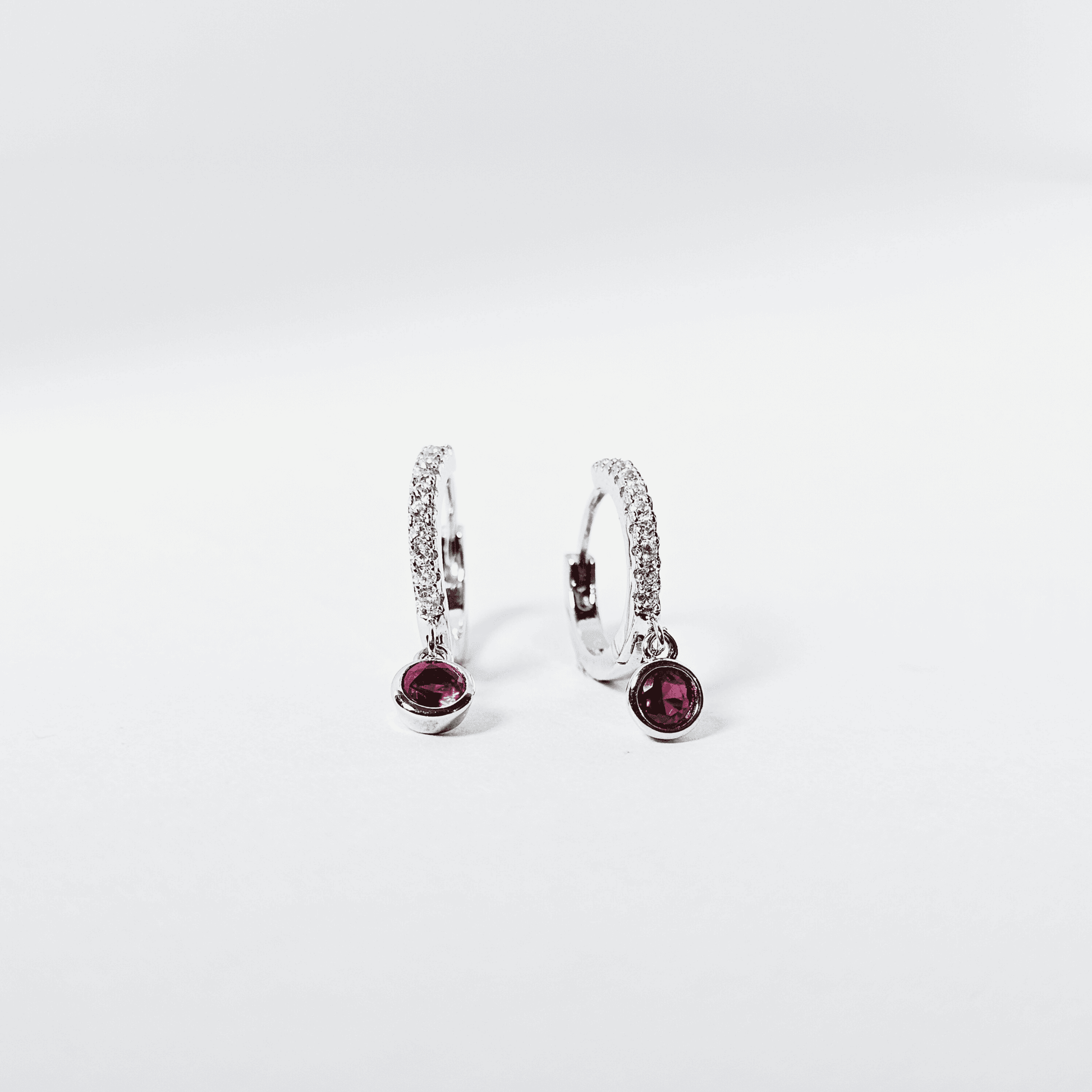 Stylish CZ silver hoop earrings featuring a ruby-colored stone accent, crafted in 925 sterling silver. Ideal for daily wear and gifting.
